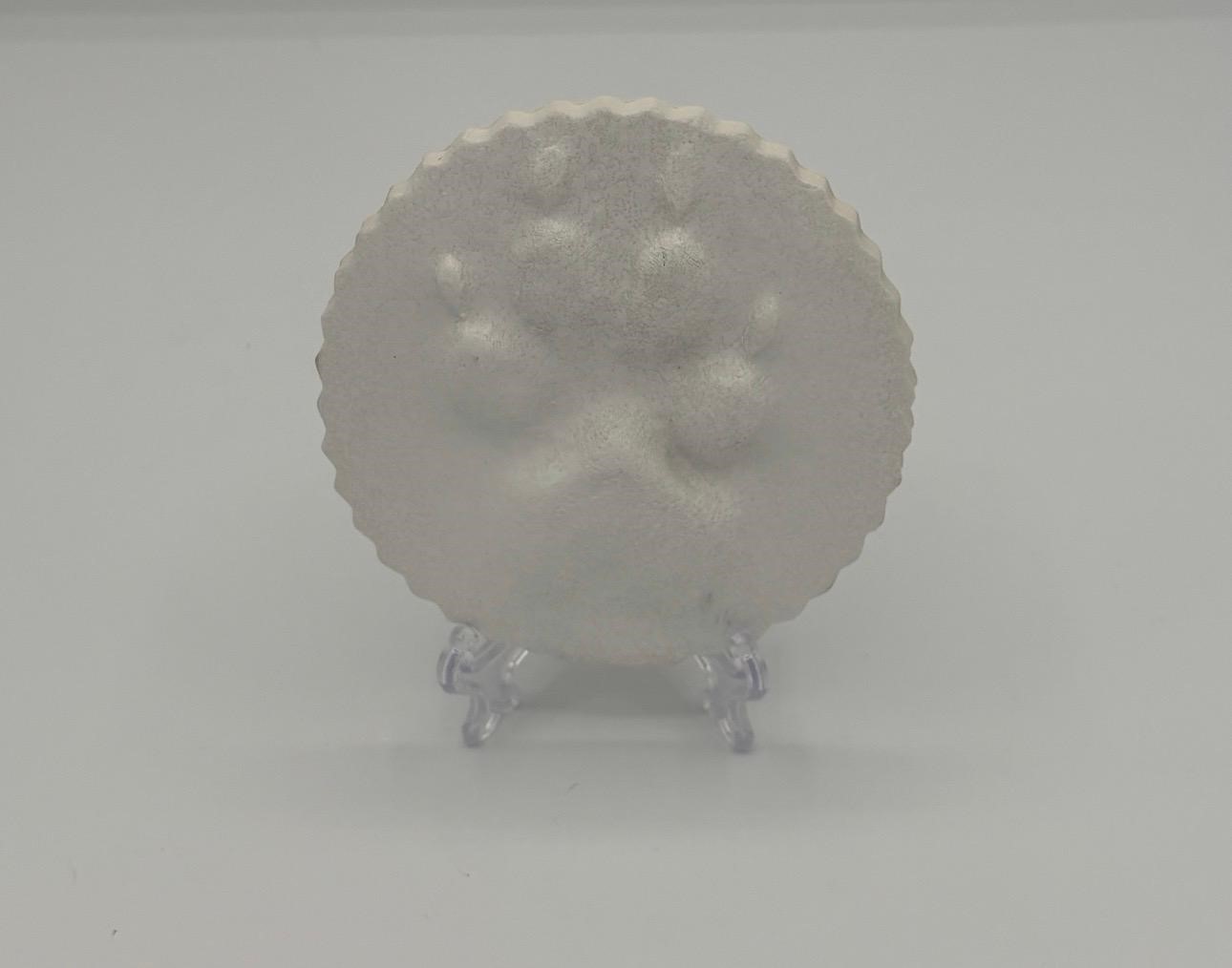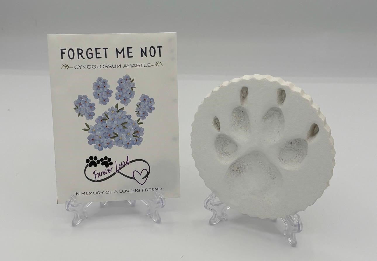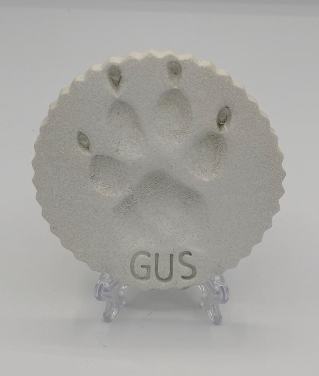 We process every paw print one at a time. The process is very labor intensive. Typically, we use the front paws to make the impression. If the front paw is not accessible, we will use a back paw. We press extremely hard to ensure we get a really good quality impression. Once the paw impression is made, we place an identifying label on it and then we bake it in an oven. Once it cools, we sand and paint them. We do not trim the nails or fur unless requested. If multiple paw prints are requested, we use the same paw unless noted otherwise. If we are asked to do two or more different paws, we will label each paw accordingly.